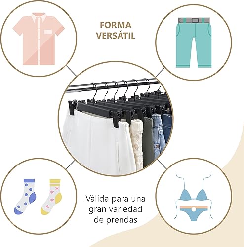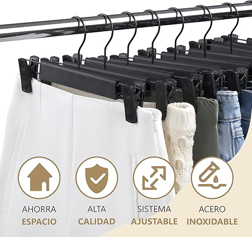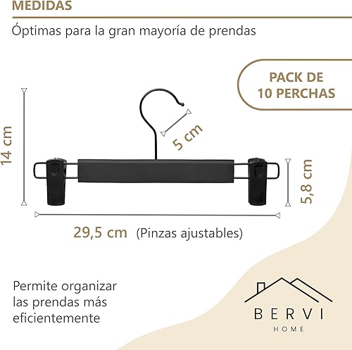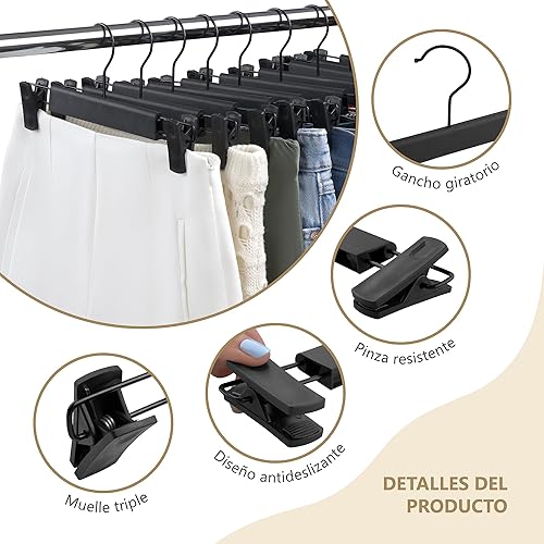 BERVI HOME Lot de 10 cintres avec pinces, cintres gain de place, cintres jupes, cintres à pinces noires, crochets réglables, antidérapants et durables pour ranger les vêtements.