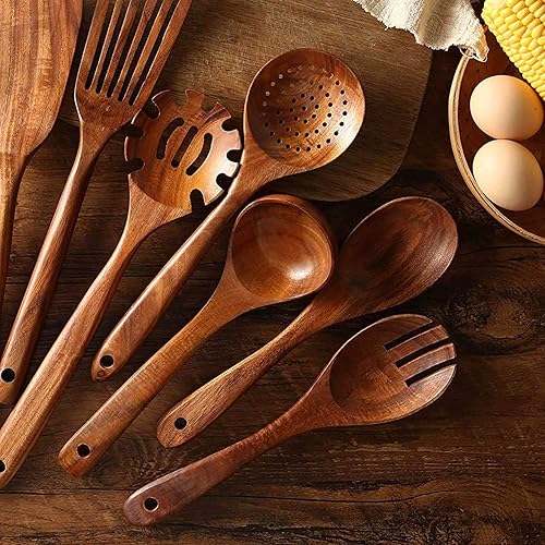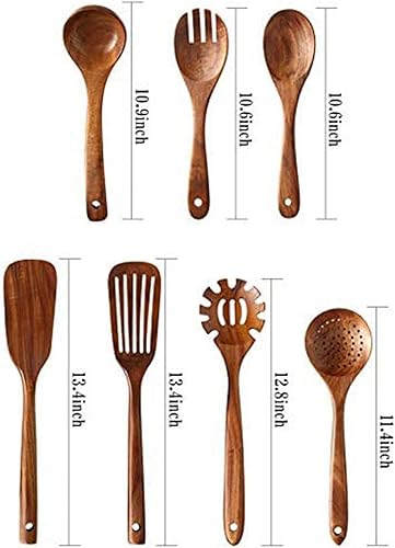 Fransande Ensemble de 7 Pièces d'Ustensiles de Cuisine en Bois de Teck Naturel: Cuillères en Bois pour