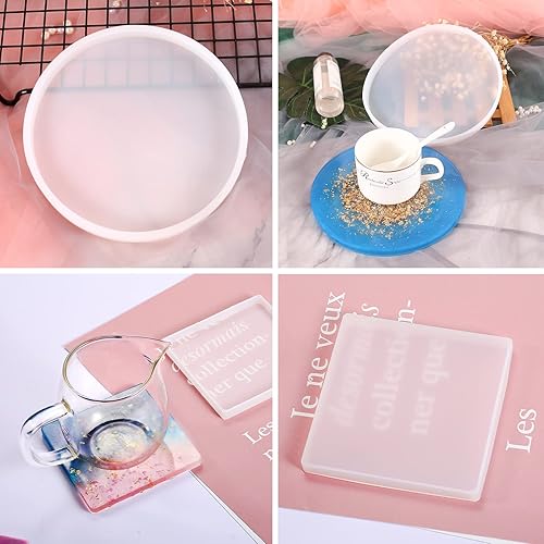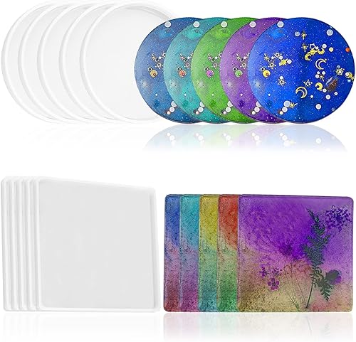 findTop Lot de 10 moules en silicone pour sous-verre, 5 moules ronds et 5 carrés réutilisables en résine pour l'artisanat époxy, ciment, argile polymère, antiadhésive, bricolage
