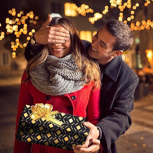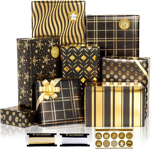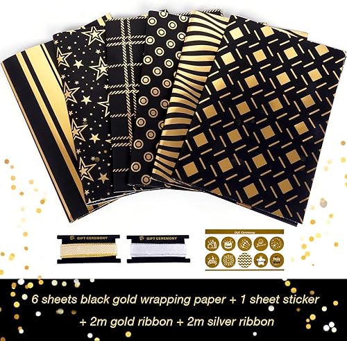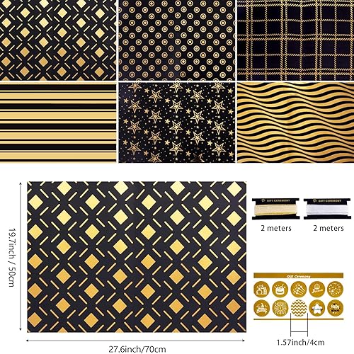 Lot de 6 rouleaux de papier cadeau d'anniversaire - Noir et doré - Pour enfants et adultes - Pour anniversaire, Saint-Valentin, mariage, baby shower, 50 x 70 cm