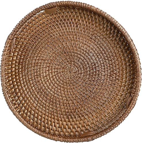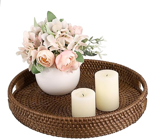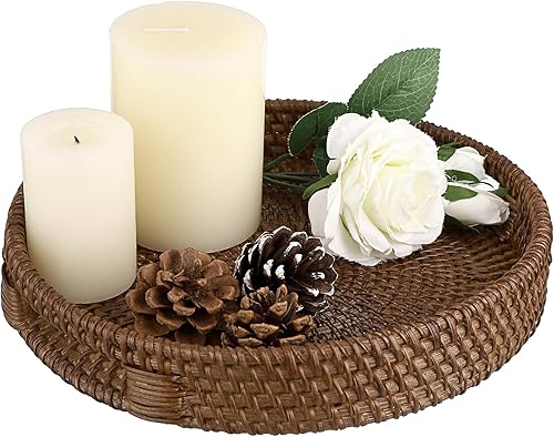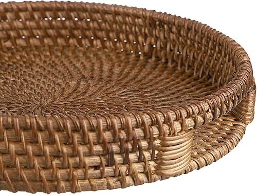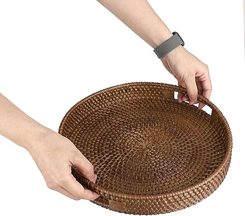 IGNPION Plateau de service décoratif en rotin de 30 cm avec poignée, plateau de rangement pour vaisselle, maquillage, coiffeuse, bijoux, bougies, ornements, blanchi à la chaux