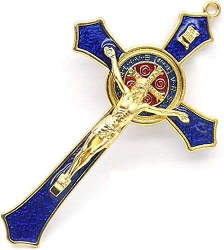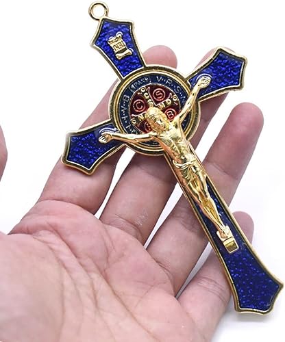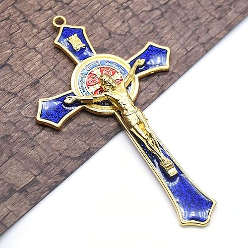 BRAVECOW Décoration murale vintage en métal doré avec croix, crucifix Jésus, saint religieux sculpté Christ (bleu)