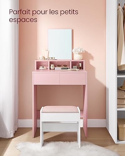 VASAGLE Coiffeuse avec Grand Miroir, Table de Maquillage, avec 2 Tiroirs et 3 Compartiments, Coin Beauté, Style Moderne, Rose Bonbon RDT103R01