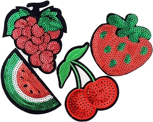 Patches Fruits Ecussons Applique Paillettes Raisin Cerise pastèque Fraise été Badge thermocollants a Coudre