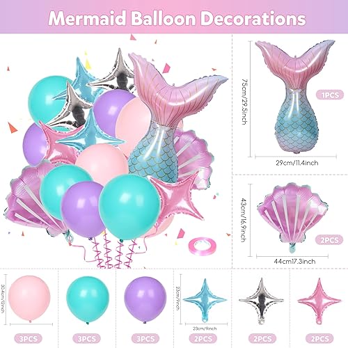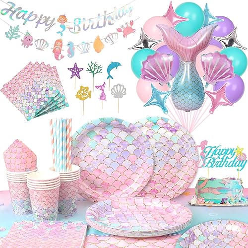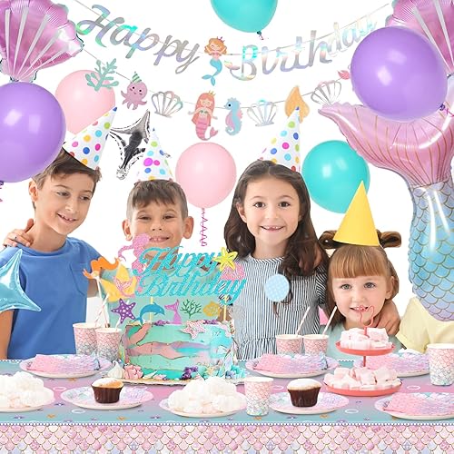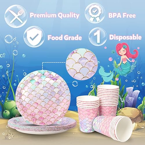 Jonvell 94 PCS Ensemble de Vaisselle de Fête Sirène Anniversaire Vaisselle Sirène Assiettes en Papier Sirène Tasses Serviette Nappe Fournitures de Fête de Sirène Décoration Anniversaire (16 Invités)