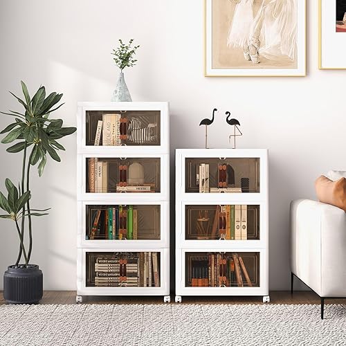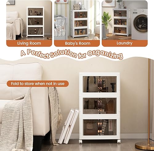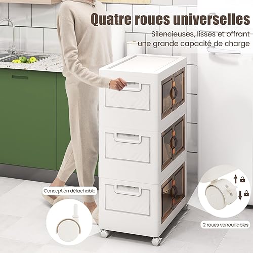 GOPLUS Boîtes de Rangement Empilables, 3 Bacs de Armoire avec Roues Verrouillables, Poignée Pratique, Commode Pliable en PP avec Couvercle & Portes pour Salon (44,5x30x77,5cm)