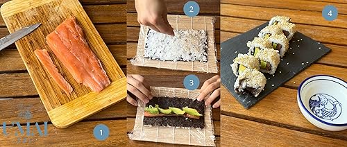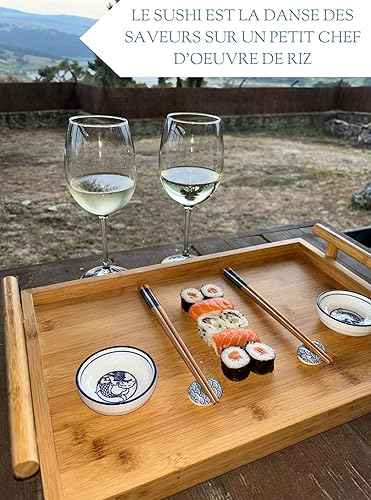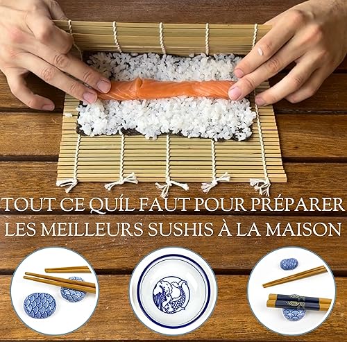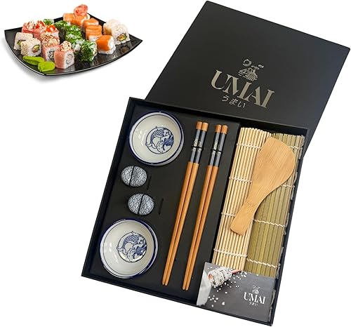 UMAI Kit Sushi | Kit pour faire des sushis à la maison | Set de sushis 2 tapis à sushis + palette + 2 jeux de baguettes + 2 bols de soja + 2 supports baguettes + QR livre de recettes