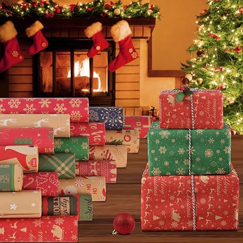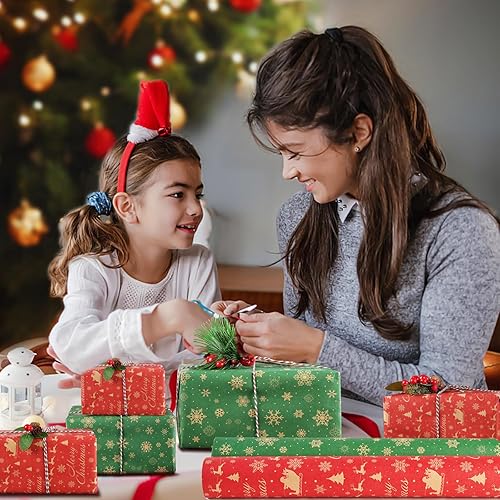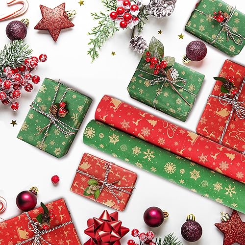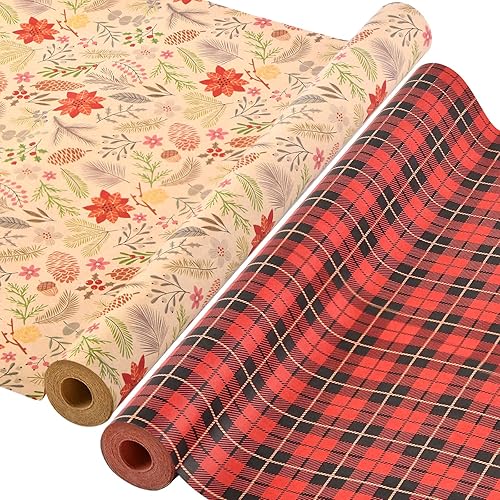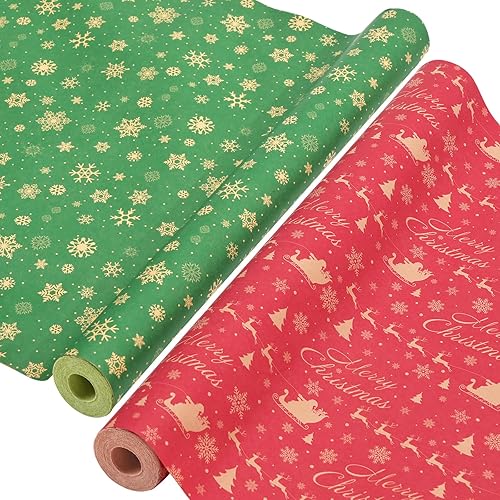 AhfuLife 2 Rouleaux Kraft Papier Cadeau Noël, 43cm×15m Recyclable Papier Emballage Avec Motifs Fins Pour Enfant, Décoration (H: Luge/Flocons de Neige)