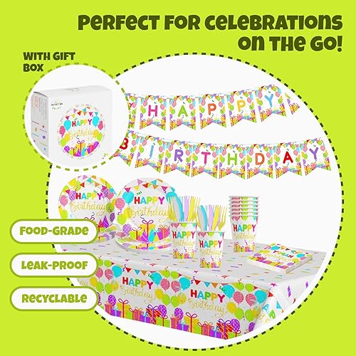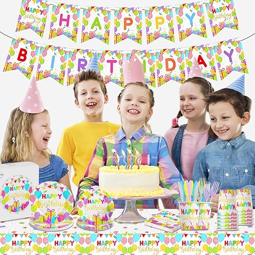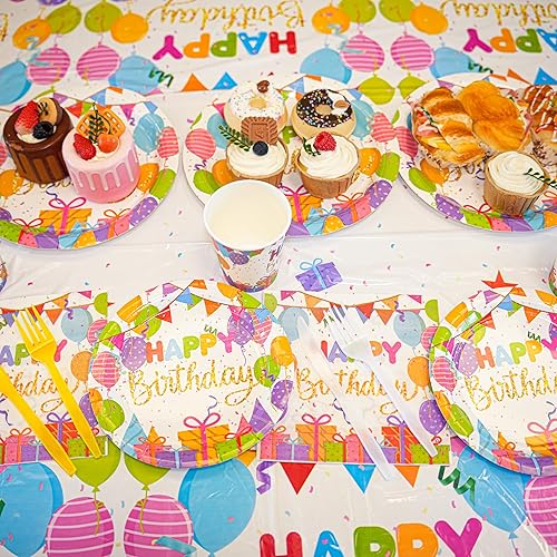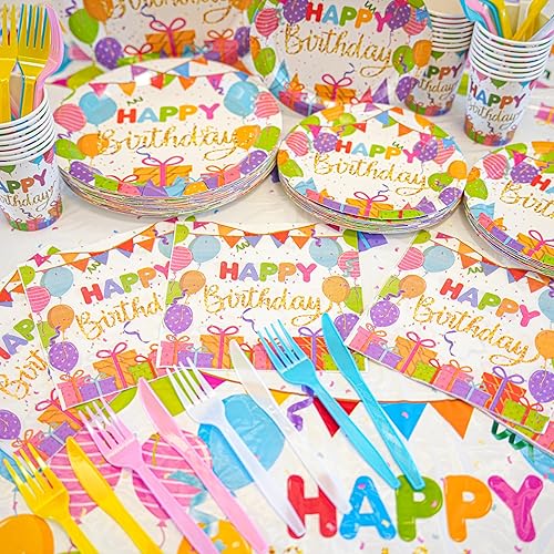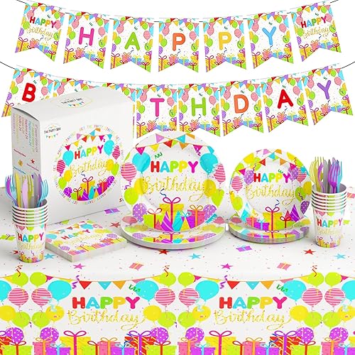Happy birthday party Supplies set comprenant des assiettes, des serviettes, des tasses, des fourchettes, des couteaux, des bannières et des nappes de 7 et 9 pouces – 146 pièces au total