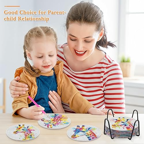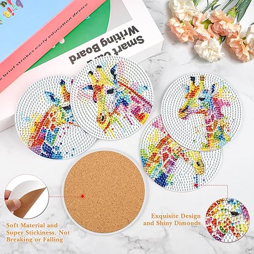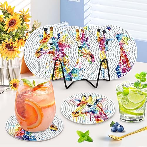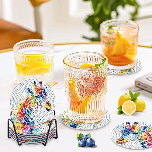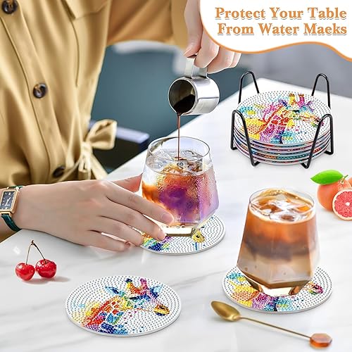 NAIMOER 6 Pièces Peinture Diamant Dessous de Verre, Girafe Diamond Painting Dessous de Verre Absorbants en Liège et Céramique avec Support en Métal Lapin Animaux Diamant Painting Dessous