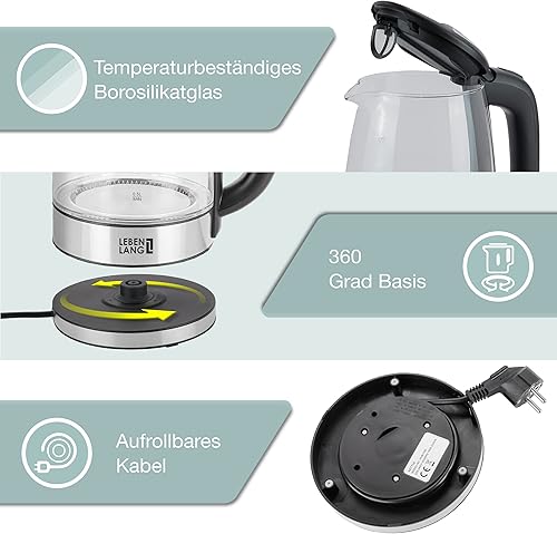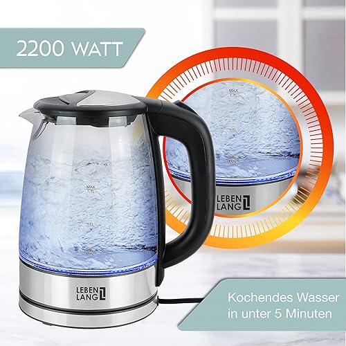 LEBENLANG Bouilloire électrique design en verre - avec LED, filtre anticalcaire, 2200 watts & 1.7L | Bouilloire en verre LED sans fil | Bouilloire en verre sans plastique avec filtre anticalcaire