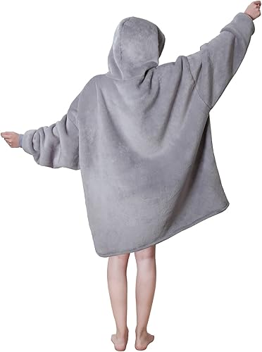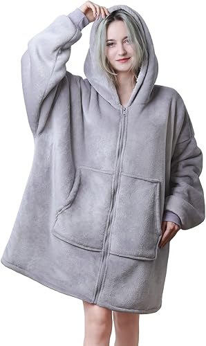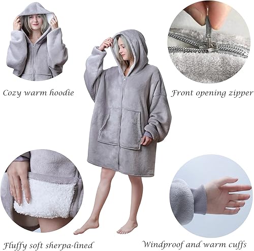 Queenshin Sweat à Capuche Polaire Couverture Zip avec Poche et Fermeture éclair, Gris Douce et Chaude Sweat Plaid en Flanelle et Sherpa, Taille Unique