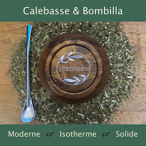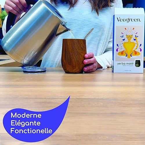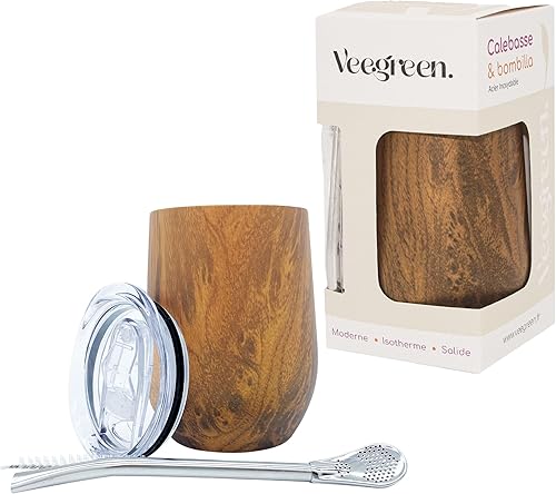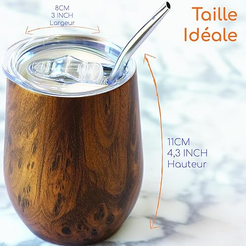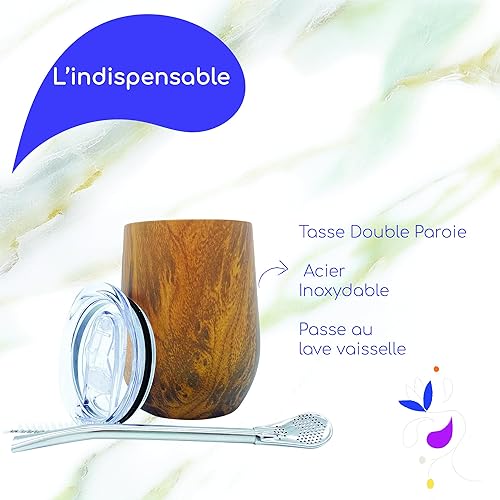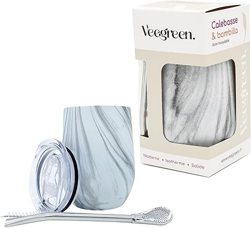 Kit Calebasse Yerba Maté | Tasse isotherme + Paille Bombilla traditionnelle + Couvercle type thermos | Gourde Idéale pour boire le Maté chaud | Double paroi en acier inoxydable (Marbre)