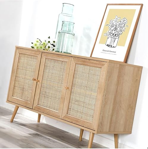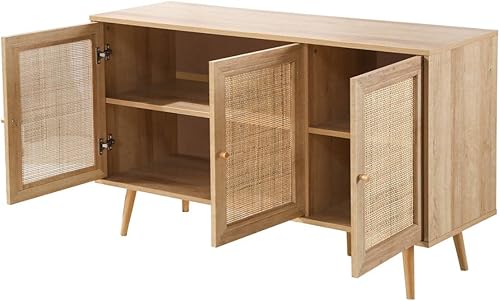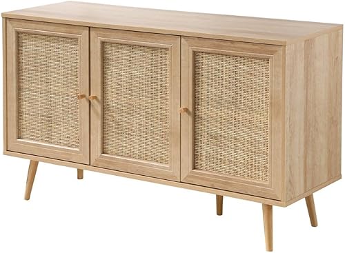 Calicosy - Buffet avec 3 Portes - Décor Cannage en Rotin - Style Naturel et Tendance - Meuble de Rangement Bas Décor Bois - pour Salon, Salle à Manger - L120 x P39 x H70 cm