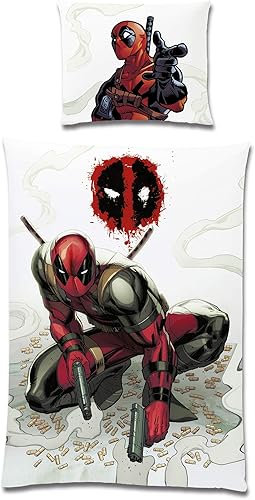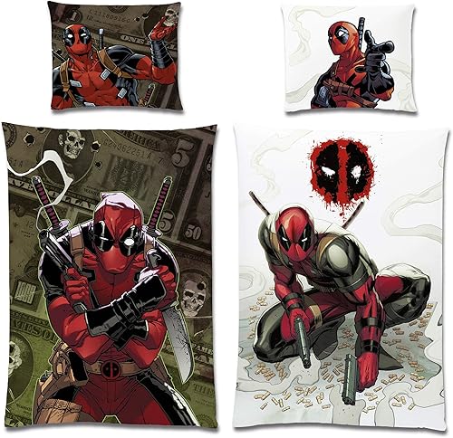 BERONAGE Deadpool Parure de lit réversible Blanc/vert 135 x 200 cm + 80 x 80 cm 100 % coton renforcé de qualité avec fermeture éclair YKK Masque anti-héros Marvel Comic Parure de lit pour enfant
