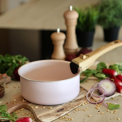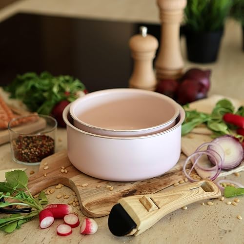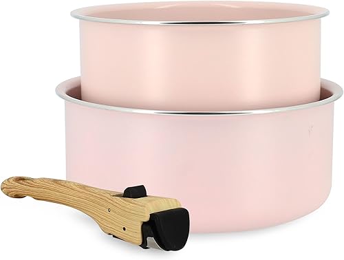 MENASTYL - Lot de 2 casseroles amovibles revêtement antiadhésif céramique sans PFAS/PTFE - 2 casseroles 16/18cm et 1 poignée - Tous feux dont induction – Alu recyclé Rose - 6020634