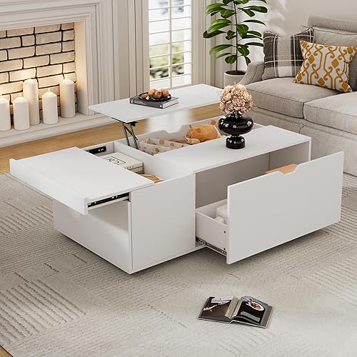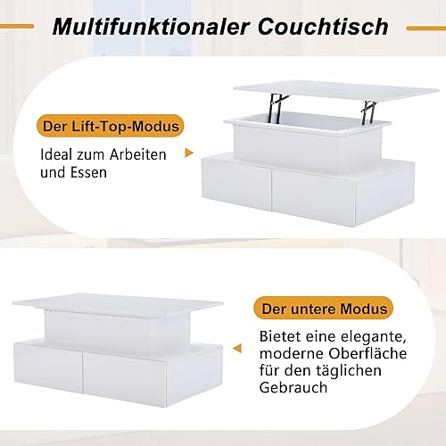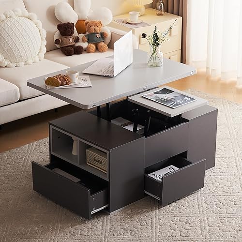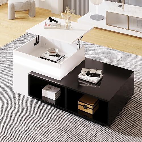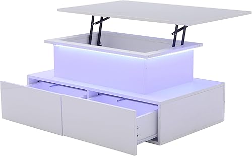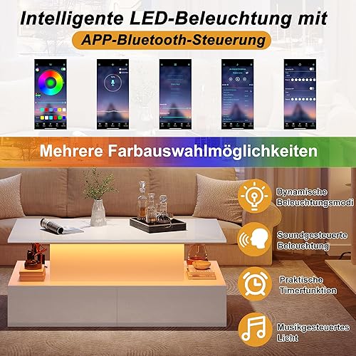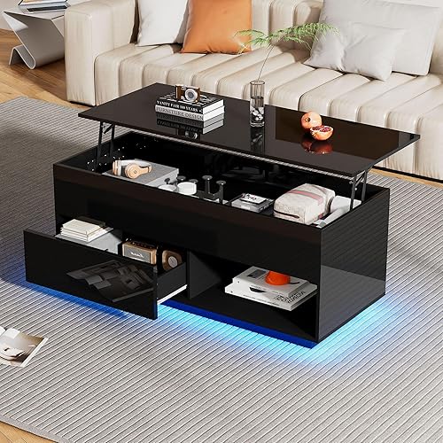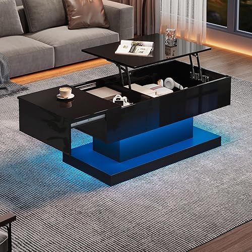 BTM Table Basse Relevable, Table Basse LED avec 4 Tiroirs et Rangement Caché, Noire Brillante, Moderne, Charge de 30kg, 90x55x41