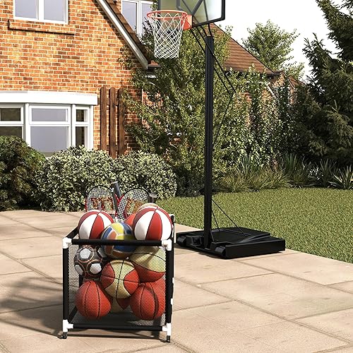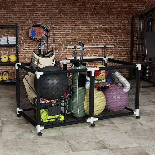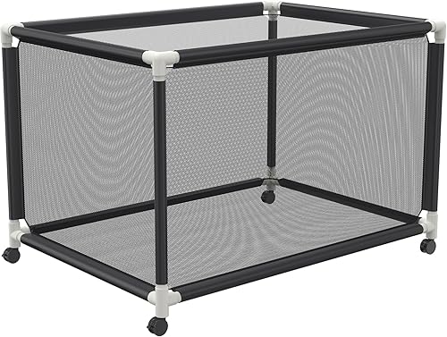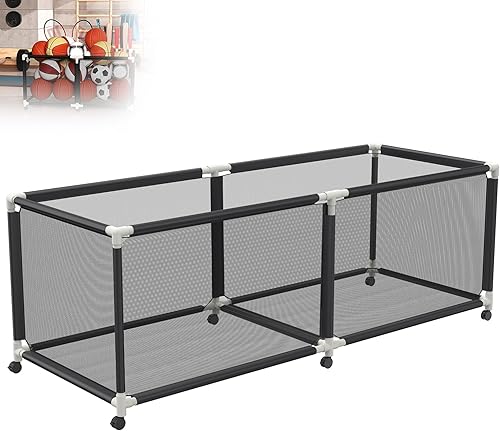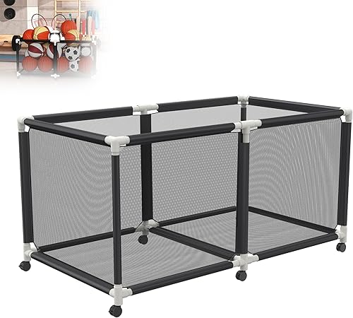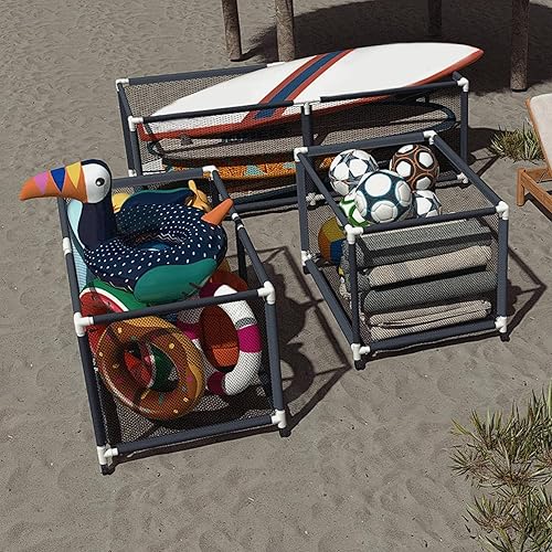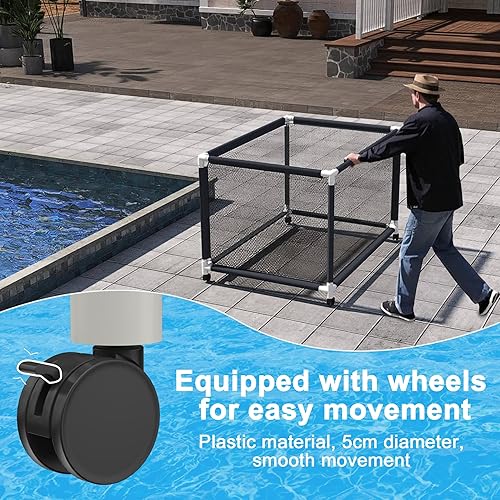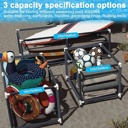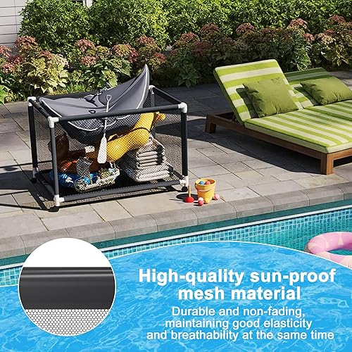 TATIVALO Boîte de rangement pour piscine 122 × 78 × 88 cm – Grand organisateur avec panier en filet, tubes en PVC et roulettes, pour bouées, matelas gonflables et jouets de piscine – Noir