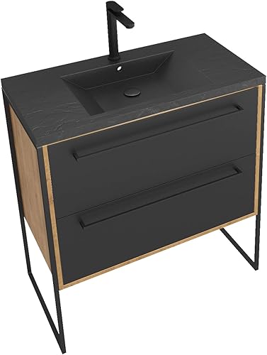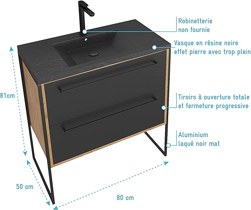 AURLANE Meuble de Salle de Bain 80x50cm Chene Brun - 2 tiroirs Noir Mat - Vasque resine Noire Effet Pierre