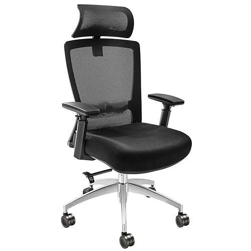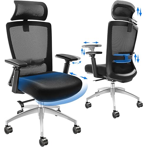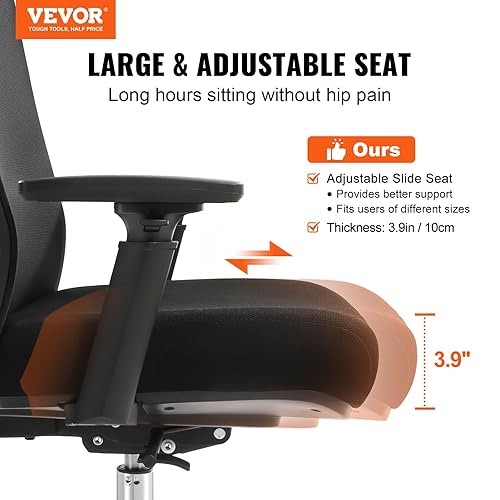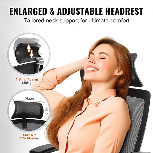 VEVOR Chaise de Bureau Ergonomique avec Support Lombaire Appui-Tête Accoudoirs Réglables Fauteuil de Bureau Inclinable Large Siège Coulissant Confortable avec Roulettes Pivotantes