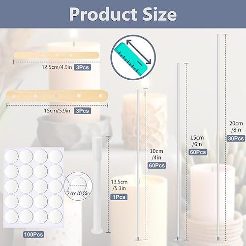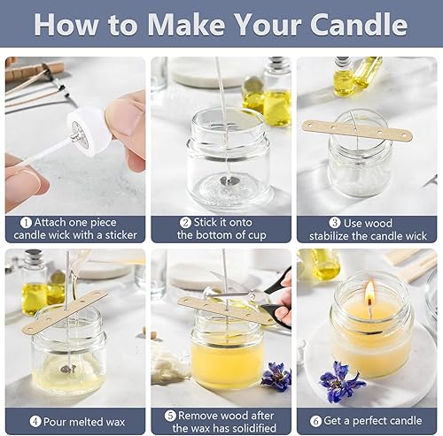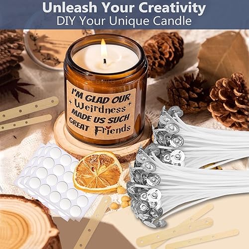 SEOIMU Lot de 150 mèches de bougie pour la fabrication de bougies, 100 autocollants pour mèche de bougie, 6 dispositifs de centrage de mèche de bougie en bois, mèche en coton pré-ciré avec languettes