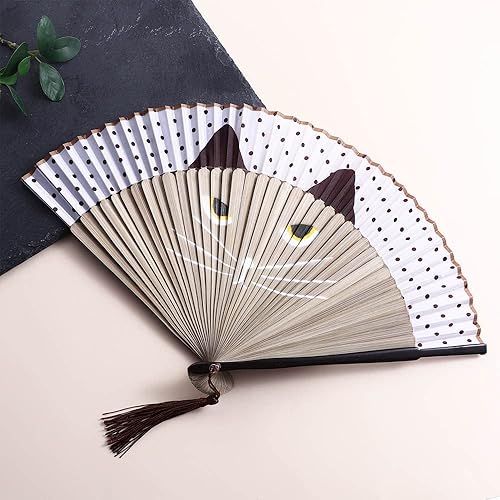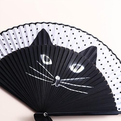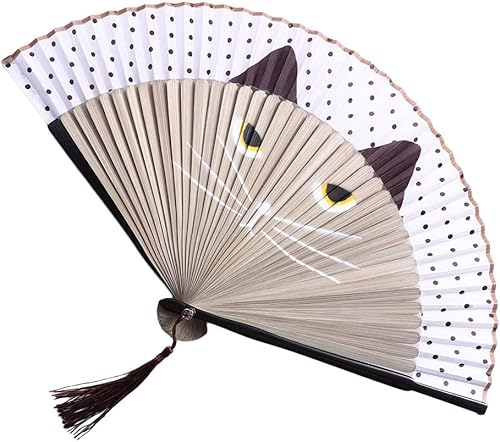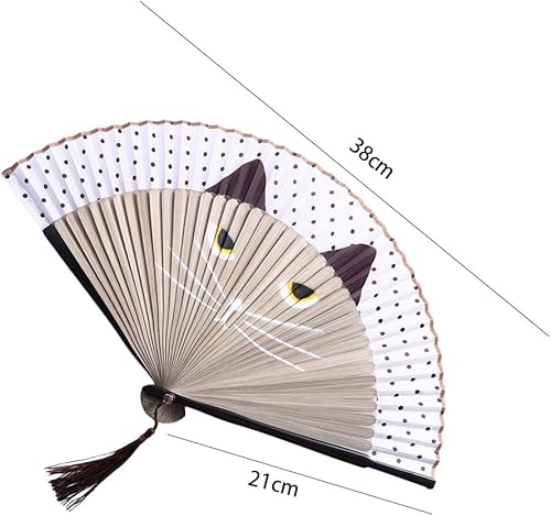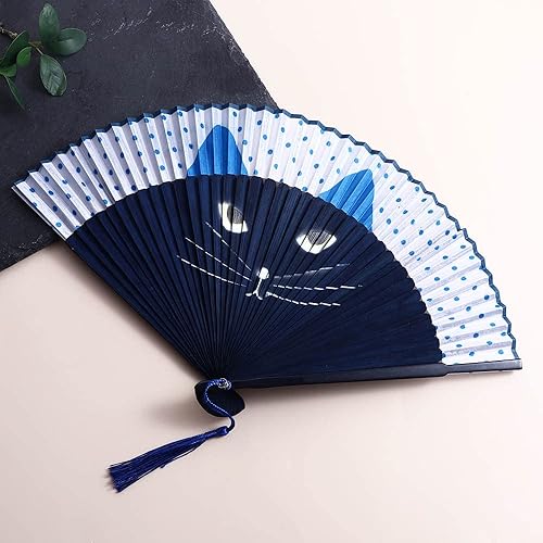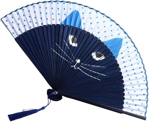 Éventail pliable en soie - Motif chat de dessin animé - En bambou - Pour danse, cosplay, fête de mariage - Bleu