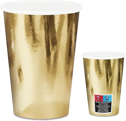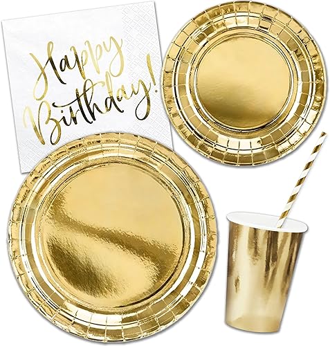 Decoraparty Set de vaisselle or pour anniversaire 6 personnes, décorations de table avec inscription Happy Birthday – 6 verres, 6 grandes assiettes, 6 petites assiettes, 20 serviettes, 10 pailles (48