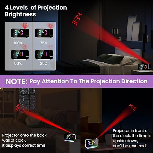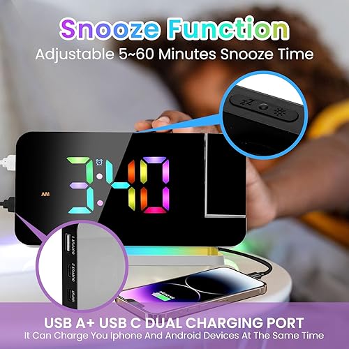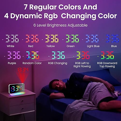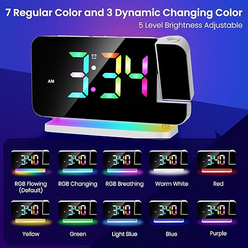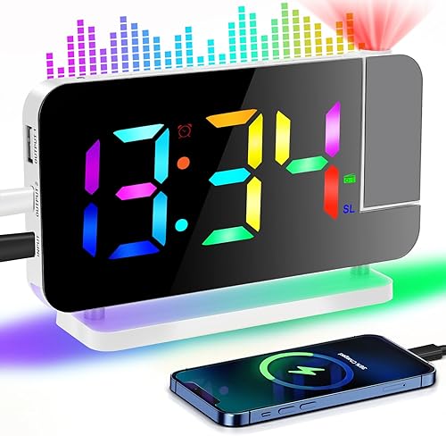 LYtech 7' Reveil Projecteur Radio Réveil avec d'éclairage Nocturne RGB Affichage LED Horloge Digitale Numérique Port de USB Niveaux de Luminosité Réglables Alarme Snooze 12/24H pour Chambre (Blanc)