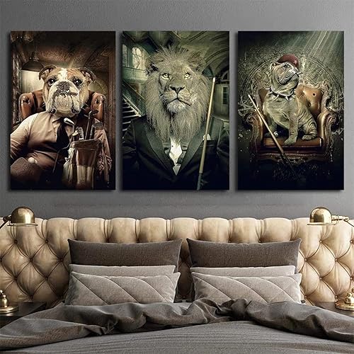 LELME Animaux Doux Jouant au Billard peintures sur Toile sur Le Mur Art Affiches et Impressions Lion dans Un Costume Mur décor à la Maison 40X60cmx3pcs sans Cadre