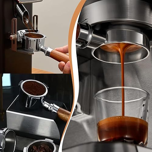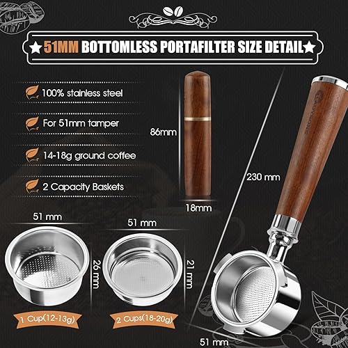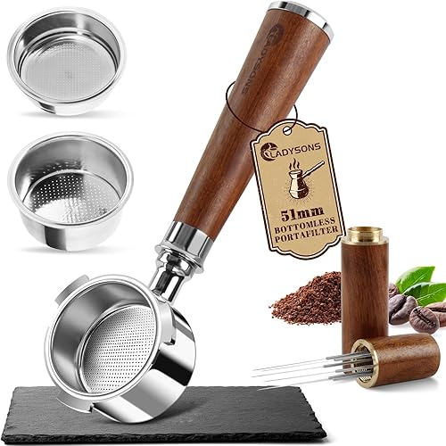 Espresso Bottomless Porte-filtre 51mm | Compatible avec DeLonghi Dedica EC680 / EC685 | Filtre à Café 51 mm avec poignée en noyer, 2 paniers inox, répartiteur d’aiguille espresso | 3 oreilles