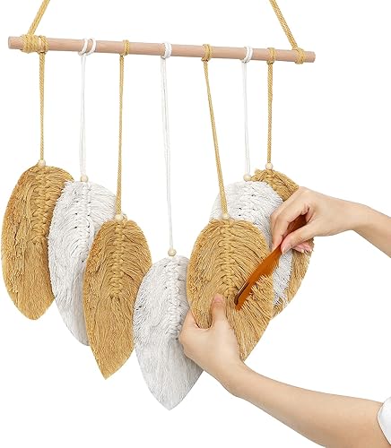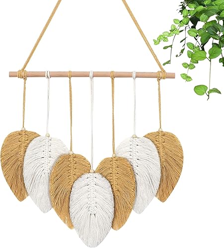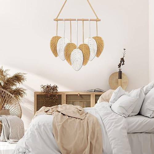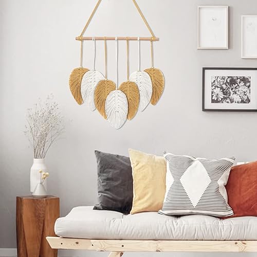 Weldomcor Tapisserie Murale en Macramé à Plumes Style BohèMe Chic Faite à la Main Feuilles Tissées Pour déCoration de Chambre à Coucher Salon Appartement Porche (Jaune)