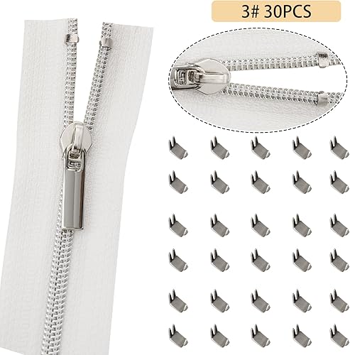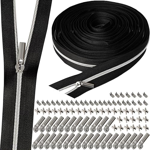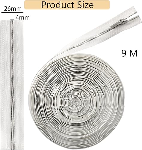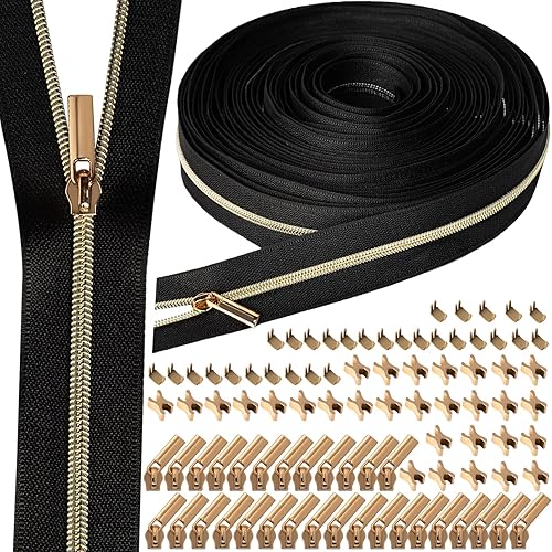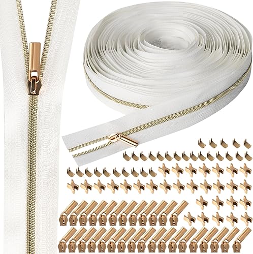 VOKABY 3# 9 M Fermeture Eclair au Metre,Comprenant 30 Tirettes de Fermeture à Glissière en Métal,60 Boucles d'arrêt Supérieures Inférieures de Fermeture à Glissière (Blanc-Or)