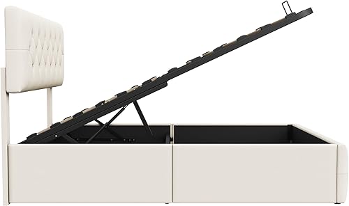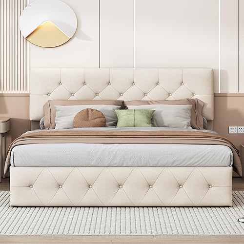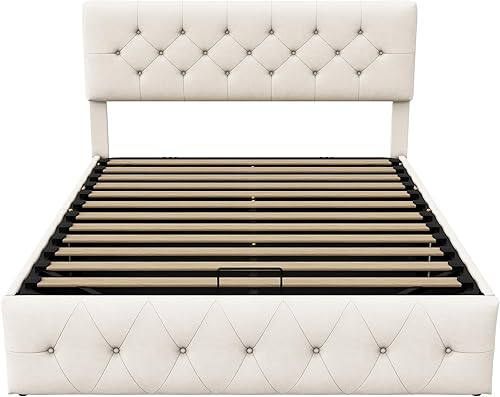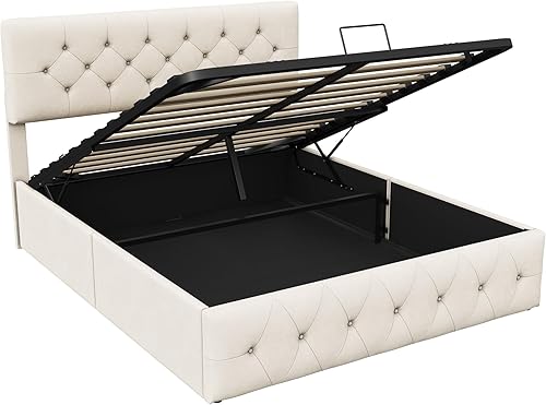 Générique Lit Coffre 140x200 avec Tête de Lit Réglable, Rembourré avec Rangement, Double avec Hydraulique, 2 Personnes pour Adultes, Adolescents, Velours, Beige (140x200 cm)