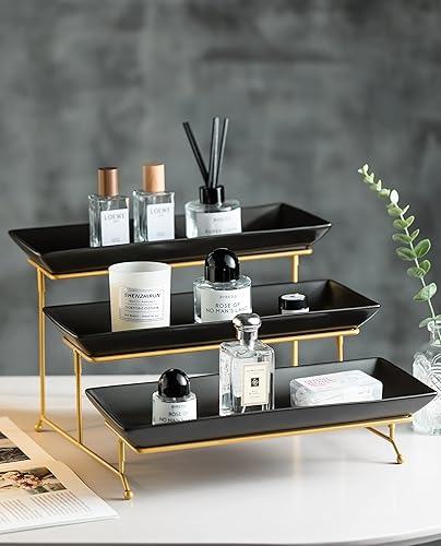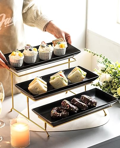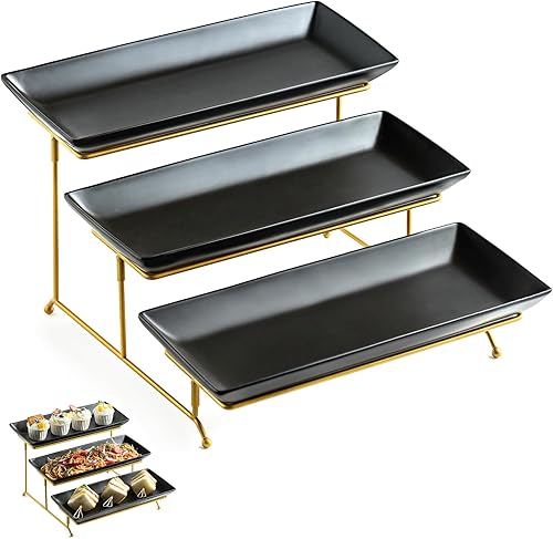 LYEOBOH Ensemble de grands plateaux de service à 3 niveaux avec support pliable et robuste, plateau de service à étages de pour apéritifs, fruits, desserts et cupcakes, blanc