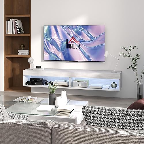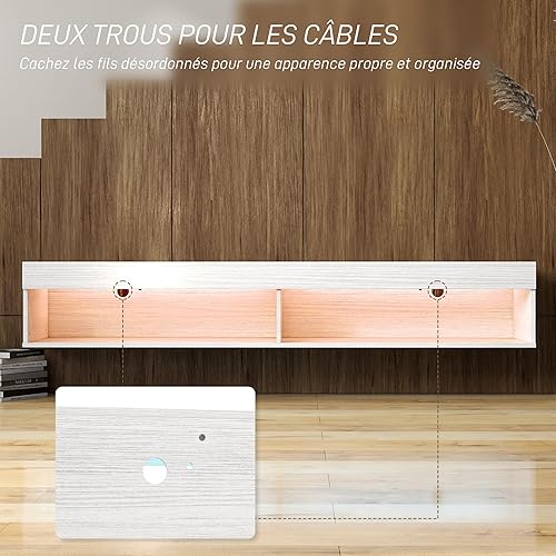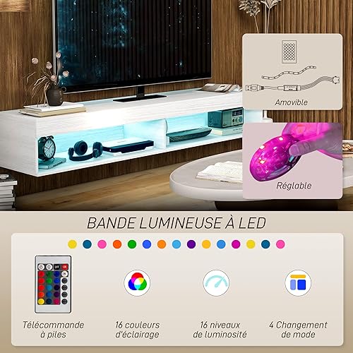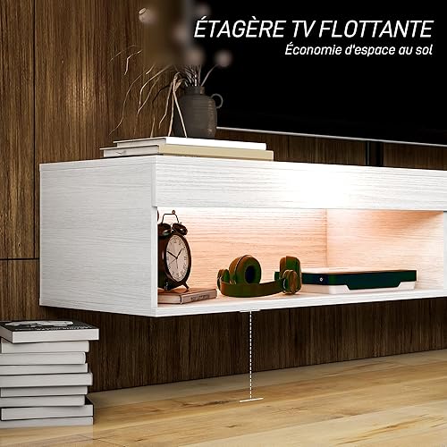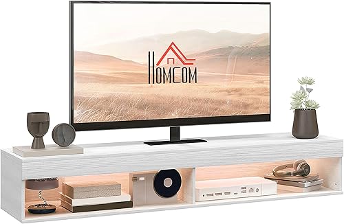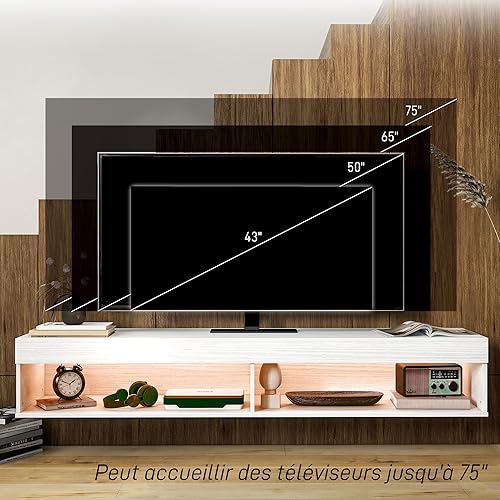 HOMCOM Meuble TV Suspendu Mural, Banc TV pour téléviseurs jusqu'à 75 Pouces, avec étagères, 1 éclairage LED, 80 x 40 x 30 cm, Blanc