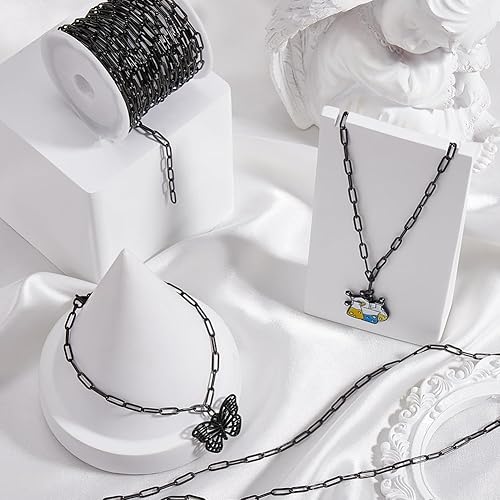 SUNNYCLUE Chaîne Trombone Noire de 32.8 m (10mm) en Acier Inoxydable Rectangulaire et Ovale avec Bobine en Plastique pour la Fabrication de Bijoux Colliers Bracelets Loisirs Créatifs