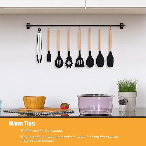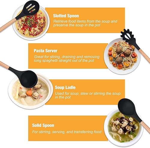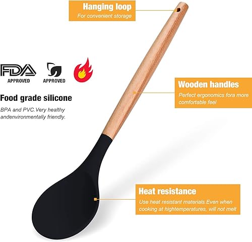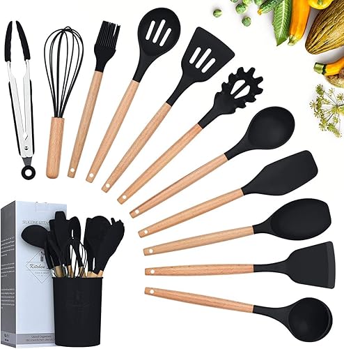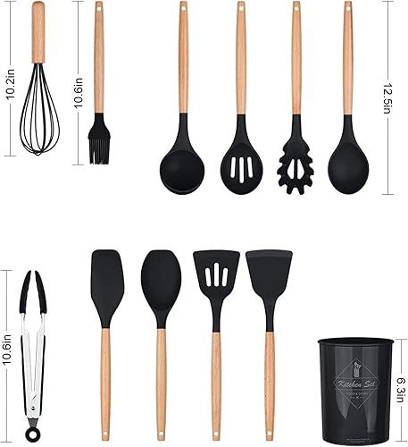 Ustensiles de Cuisine,Lychee 12PCS Kit d'Ustensiles de Cuisine en Silicone et Bois, Ustensiles Cuisine Antiadhésive Set avec Pot de Rangement,Silicone de qualité Alimentaire (Noir)