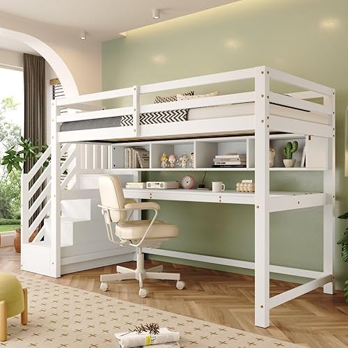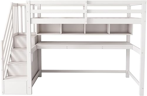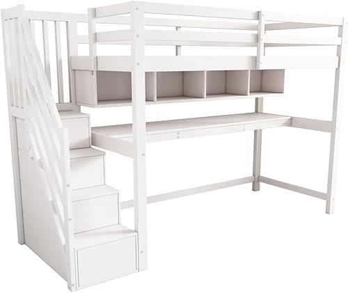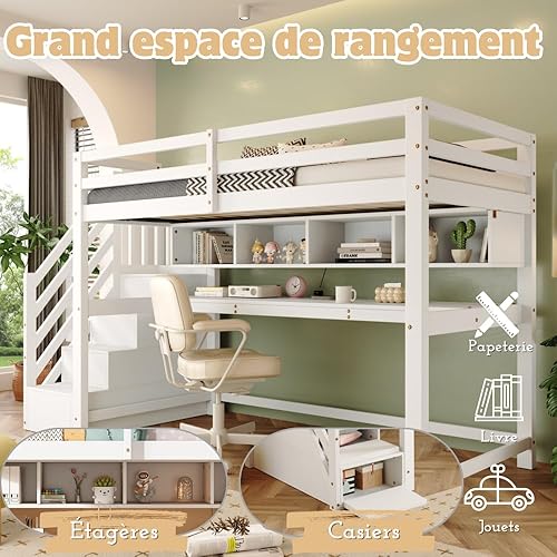 Seyakany Lit Mezzanine Enfant avec Bureau et étagères,escalier de Rangement,lit Enfant 90x200cm avec échelle de Rangement et Garde-Corps,Bois Massif + MDF (Blanc + Chêne)