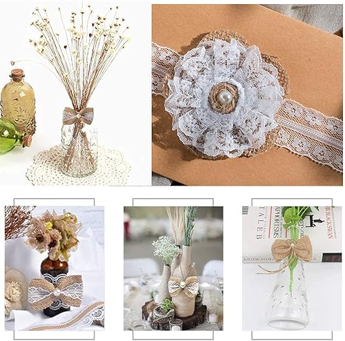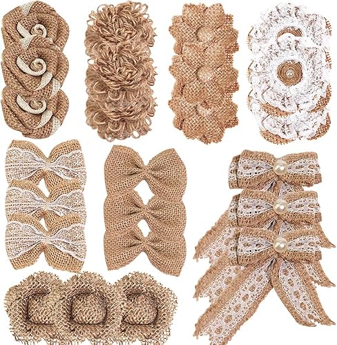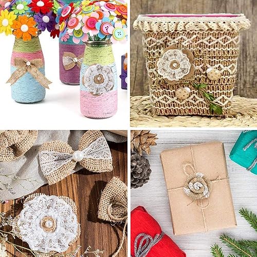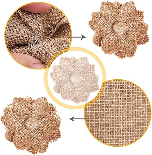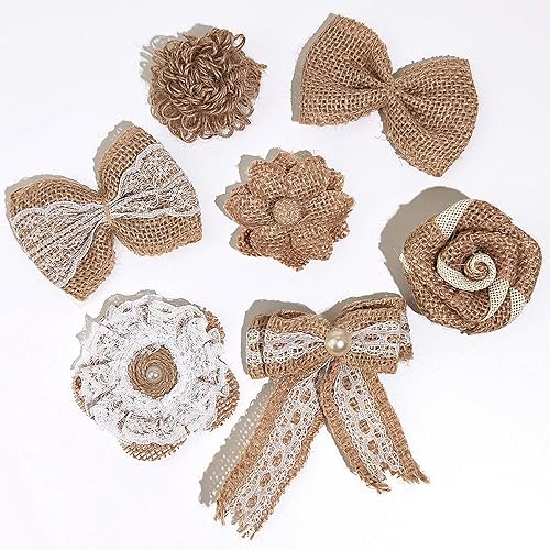 Fleurs en Toile de Jute,24 Fleurs et nœuds faits à la main Ruban en dentelle de jute Toile de jute rustique,pour DIY Loisirs Créatifs Noël Décoration