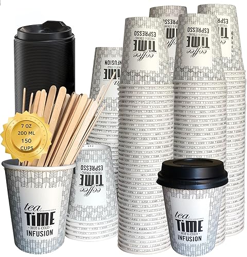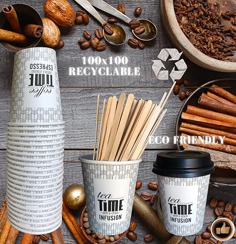 gobelets jetables avec couvercle et agitateurs 200 ml (7 Oz) Gobelets à café jetables en carton pour café, thé, eau, boissons chaudes et froides, verres à café à emporter (150 tapas y paletinas)