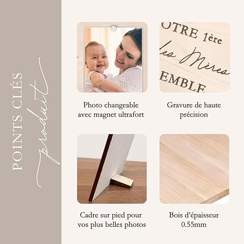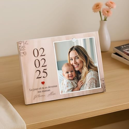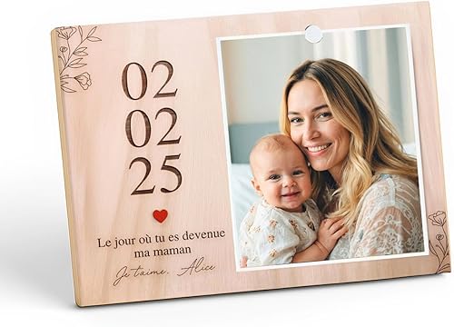 Cadeau Fête des Mères – Cadeau Maman cadre gravé bois avec photo, prénom, date et message 'Le jour où tu es devenue ma maman' – Cadeau touchant pour femme, jeune maman ou souvenir de naissance