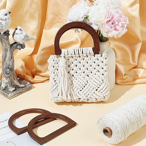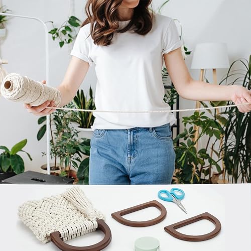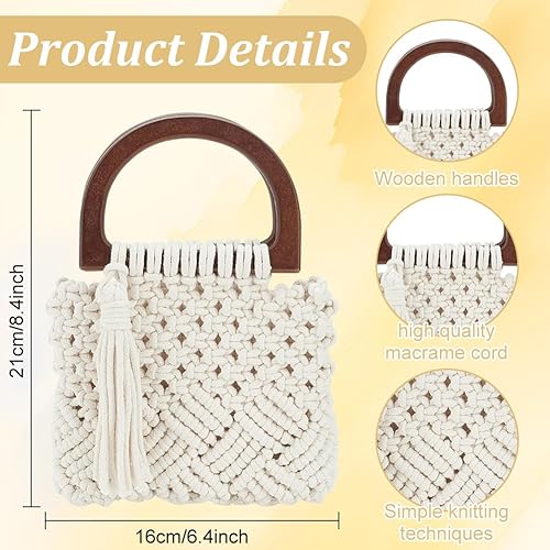 WEBEEDY Kit de Sac en Macramé Kit de Fabrication de Sac à Main en Macramé avec Franges et Pompons Sac Fourre-Tout Bohème en Macramé avec Poignée en Bois Décoration de Plage de Vacances
