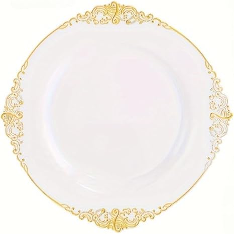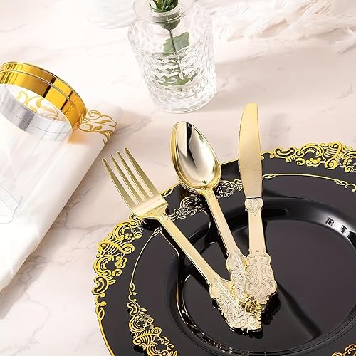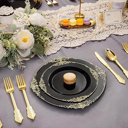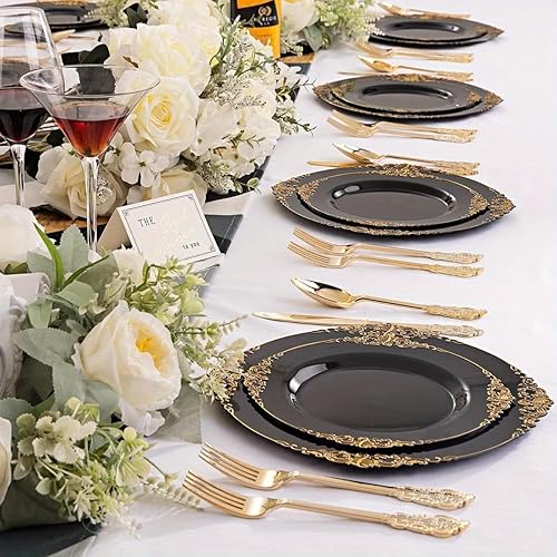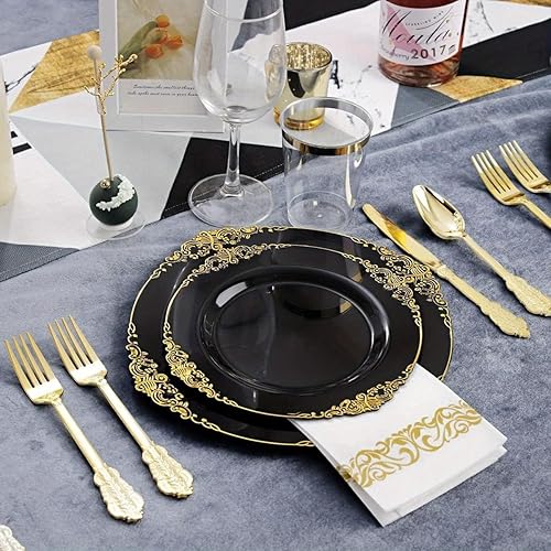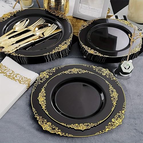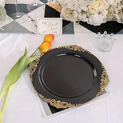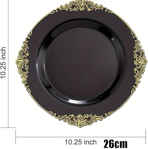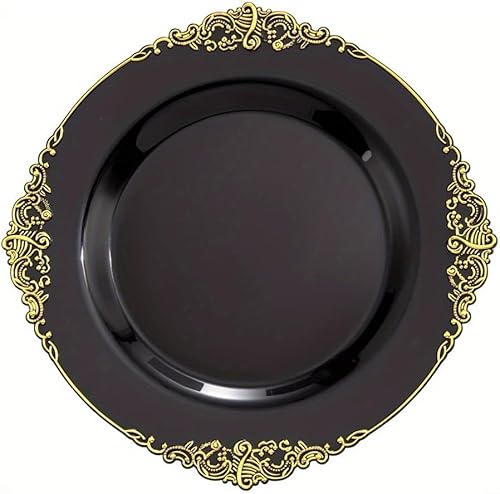 Lot de 25 assiettes à salade rondes en plastique blanc noir rose baroque 19 cm ou assiettes en plastique réutilisables avec feuille gaufrée et bord doré (noir, 26 cm)