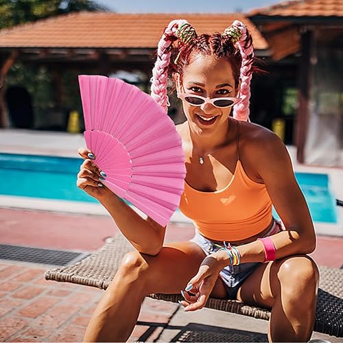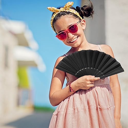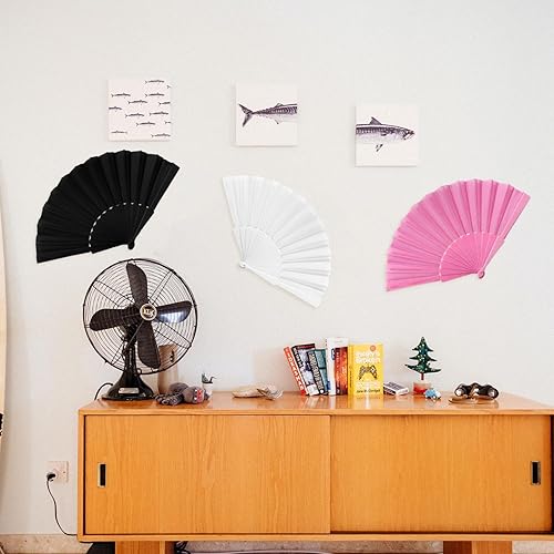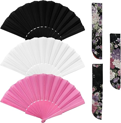 MEMOFYND Lot de 3 éventails pliants à main et 3 poches éventails, éventails portables, éventail Kung Fu Tai Chi, convient pour les cadeaux de décoration murale de fête de vacances (blanc/rose/noir)