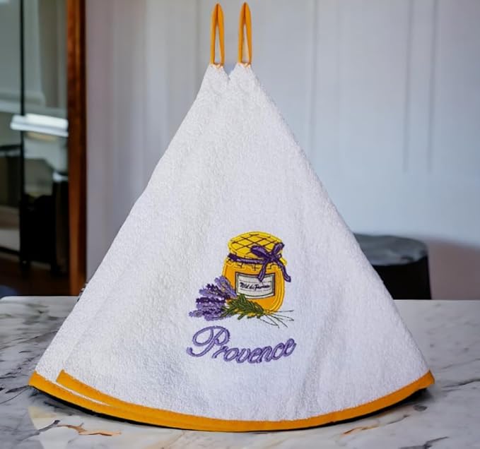 Villages de Provence - Lot de 2 Torchons Essuies Mains Pot de Miel - Rond avec Attache - Blanc - Motifs Brodés - 100% Coton - Ø 65 cm de diamètre - Cuisine ou Salle de Bain - Lavable en Machine