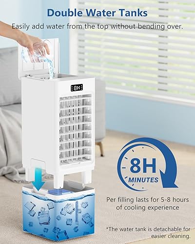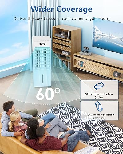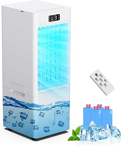 Climatiseur Mobile 4 en 1, Refroidisseur d'air, Humidificateur, loniseur, Réservoir 6L, avec 1-12H Minuterie, 3 Vitesses 4 Modes, 4 Pack Glacons,Télécommande, pour Maison Bureau Chambre