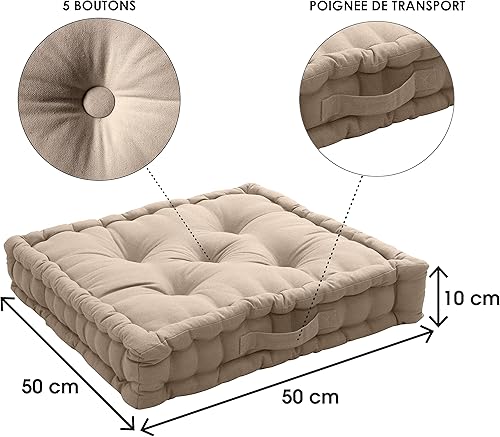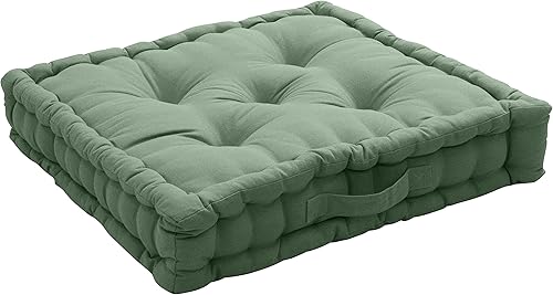 Coussin de Sol avec poignée, 50x50 cm, Vert Olive, 100% Coton, Capitonné pour Assurer Une Bonne Tenue, Idéal pour Coin Lecture, terasse ou chambe d'enfant, Collection Panama, Enjoy Home