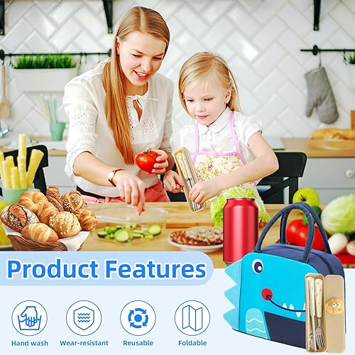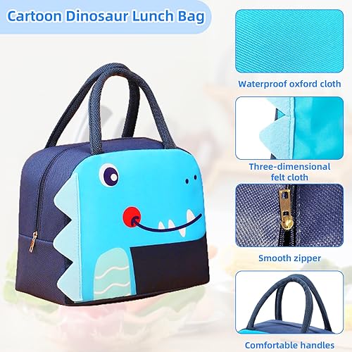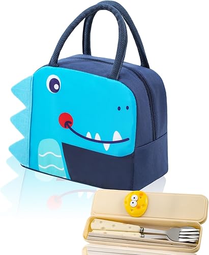 AYSYR Sac à déjeuner pour enfant - Étanche - Petit sac isotherme pour les déplacements - Mini sac isotherme pliable - Avec couverts - Pour l'école - Dinosaures de dessin animé