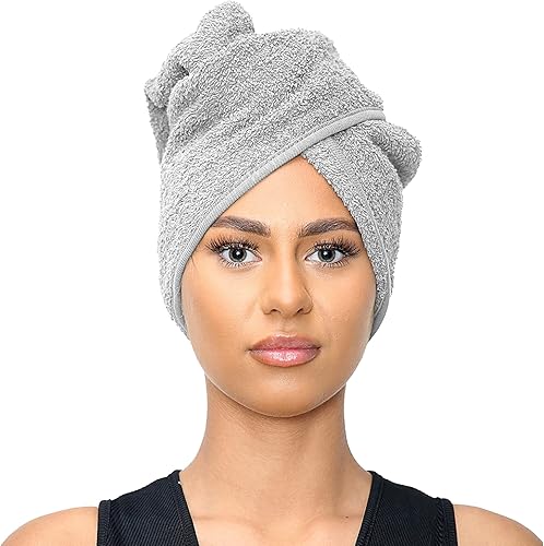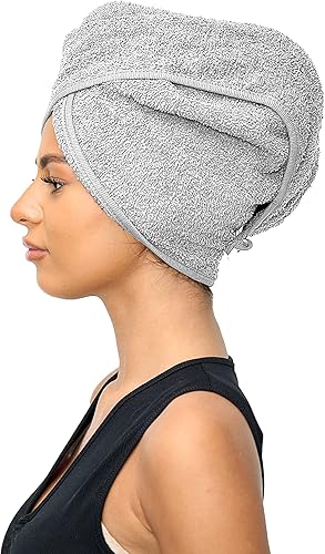 Sapphire Collection Serviette de Séchage pour Cheveux - 100% Pur Coton Éponge Doux, Turban Absorbant avec Boucle et Bouton pour Cheveux Longs (Argenté)
