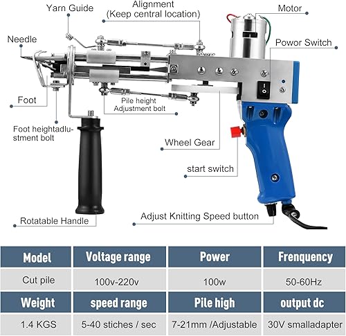 Kotsy Pistolet à Touffeter Ajustable 7-21mm Tufting Gun Cut Pile 5-40 Étapes/s Tapis électrique Tufting Pistolet Machine De Flocage De Tapis